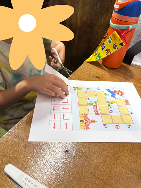 また、別のお子さんは「マリオの迷路プリント」に挑戦しました。矢印を切り取り、どのように貼ればゴールできるかを考えながら進めていきました。自分なりに工夫し、スムーズに完成!達成感いっぱいの笑顔で指導員に見せてくれました(^^)