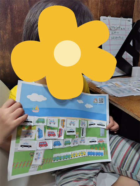 まずは「車のはさみプリント」です。車をハサミで切り取り、道路のプリントに貼り付けていきました。貼り付けるときには「ここにしようかな」と向きを考えながら丁寧に取り組み、手先を使いながら楽しむ姿が見られました(^^)