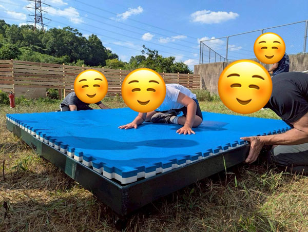 大きいマットの上でダンゴムシポーズをとり、揺れに耐えてみます。