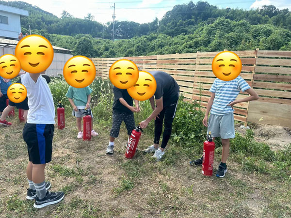 消火体験では、消火器の説明を真剣な表情で聞いたあとに、火のついた缶めがけて消火に挑戦しました!