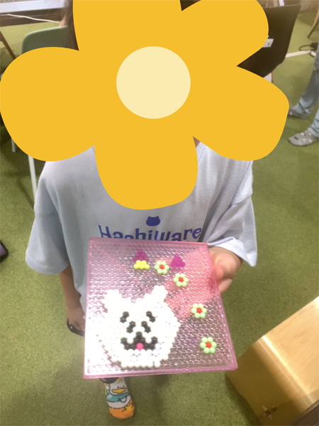 Aさんは「ちいかわ」が大好きで、一つ一つ丁寧にビーズを並べて制作しました。うまくいかないときも諦めず、やり直したり指導員に声をかけながら取り組み、最後まで完成させることができました!