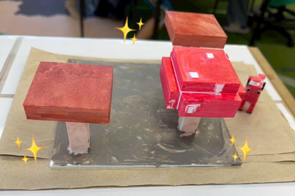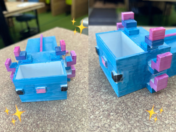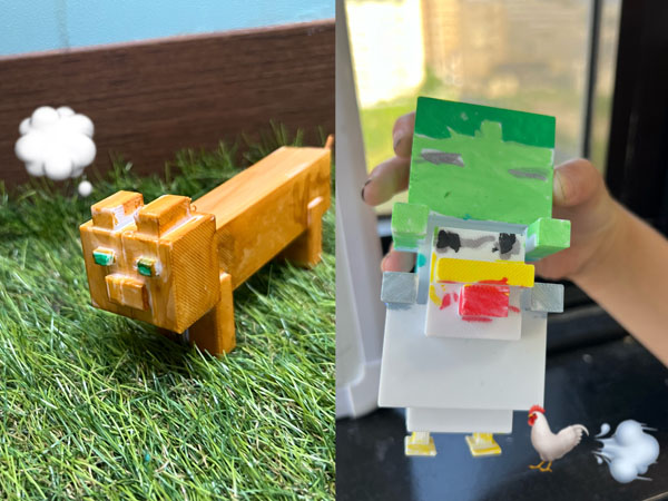 マイクラのキャラクターは角ばった姿が多いので、3Dデザインで作成しやすく、お子さん達も「マイクラの何か作りたい!」と提案してくれることが多いです!!